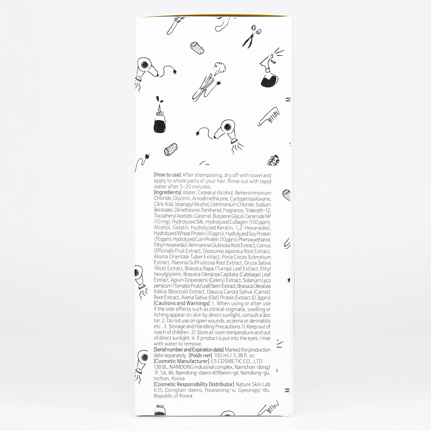 [Ingredients] Water, Cetearyl Alcohol, Behentrimonium Chloride, Glycerin, Amodimethicone, Cyclopentasiloxa ne, Citric Acid, Isopropyl Alcohol, Cetrimonium Chloride, Sodium Benzoate, Dimethicone, Trideceth-12, Panthe nol, Fragrance, Tocopheryl Acetate, Caramel, Butylene Glycol, Cornus Officinalis Fruit Extract, Rehmannia Glu tinosa Root Extract, Dioscorea Japonica Root Extract, Alisma Orientale Tuber Extract, Paeonia Suffruticosa Root Extract, Poria Cocos Sclerotium Extract, Ceramide NP (Ceramide 3) (10 mg), Alcohol, Hydrolyzed Silk, Hyd rolyzed Collagen (100 ppm), Gelatin, Hydrolyzed Kera tin, Avena Sativa (Oat) Kernel Extract, 1,2-Hexanediol, Hydrolyzed Wheat Protein (10 ppm), Hydrolyzed Corn Protein (10 ppm), Hydrolyzed Soy Protein (10 ppm), Phe noxyethanol, Daucus Carota Sativa (Carrot) Root Ext ract, Brassica Oleracea Italica (Broccoli) Extract, Api um Graveolens (Celery) Extract, Brassica Oleracea Ca pitata (Cabbage) Leaf Extract, Oryza Sativa (Rice) Ex tract, Brassica Rapa (Turnip) Leaf Extract, Ethylhexyl glycerin, Solanum Lycopersicum (Tomato) Fruit/Leaf/ Stem Extract
