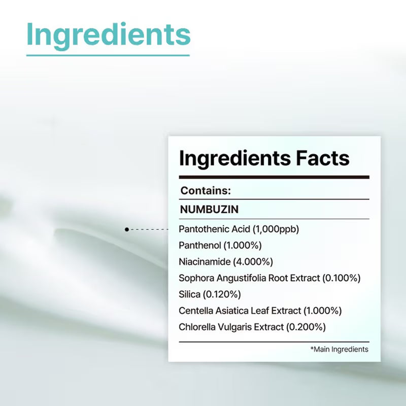 Full Ingredient List: Water, Butylene Glycol, Glycerin, Niacinamide, Cetyl Ethylhexanoate, Dicaprylyl Carbonate, 1,2-Hexanediol, Pentylene Glycol, Vinyl Dimethicone, Centella Asiatica Extract, Chlorella Vulgaris Extract, Sophora Angustifolia Root Extract, Melia Azadirachta Leaf Extract, Melia Azadirachta Flower Extract, Coccinia Indica Fruit Extract, Ocimum Sanctum Leaf Extract, Curcuma Longa (Turmeric) Root Extract, Aloe Barbadensis Flower Extract, Solanum Melongena (Eggplant) Fruit Extract, Corallina Officinalis Extract, Camellia Sinensis Leaf Extract, Centella Asiatica Leaf Extract, Cladosiphon Okamuranus Extract, Salix Alba (Willow) Bark Extract, Houttuynia Cordata Extract, Coffea Arabica (Coffee) Seed Extract, Citrus Aurantium Bergamia (Bergamot) Leaf Extract, Pinus Densiflora Leaf Extract, Alpha-Arbutin, Argania Spinosa Kernel Oil, Sesamum Indicum (Sesame) Seed Oil, Serenoa Serrulata Fruit Extract, Glycyrrhiza Glabra (Licorice) Root Extract, Caprylyl Methicone, Erythritol, Panthenol, Hydroxyethyl Acrylate/Sodium Acryloyldimethyl Taurate Copolymer, Dimethiconol, Polymethylsilsesquioxane, Acrylates/C10-30 Alkyl Acrylate Crosspolymer, Glucose, Tromethamine, Silica, Fructooligosaccharides, Fructose, Ethylhexylglycerin, Sodium Phytate, Glyceryl Acrylate/Acrylic Acid Copolymer, Caprylic/Capric Triglyceride, Hydrogenated Lecithin, Tocopherol, Decyl Glucoside, Pantothenic Acid, Polyglyceryl-4 Caprate, Polyglyceryl-6 Caprylate, Zinc PCA, Methyl Diisopropyl Propionamide, Beta-Sitosterol, Xanthan Gum.