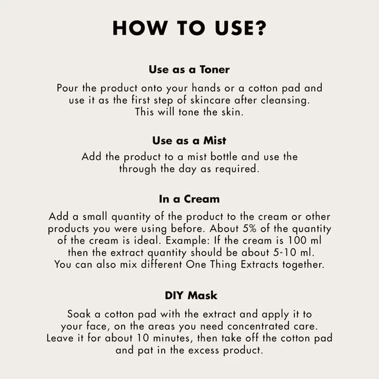Use as a Toner: Pour the product onto your hands or a cotton pad and use it as the first step of skincare after cleansing. This will tone the skin. Use as a Mist: Add the product to a mist bottle and use through the day as required. In a Cream: Add a small quantity of the product to the cream or other products you were using before. About 5% of the quantity of the cream is ideal. Example: If the cream is 100ml, then the artemisia extract quantity should be about 5-10ml. You can also mix different ONE THING extracts together. DIY Mask: Soak a cotton pad with the extract and apply it to your face, on the areas you need concentrated care. Leave it for about 10 minutes, then take off the cotton pad and pat in the excess product.